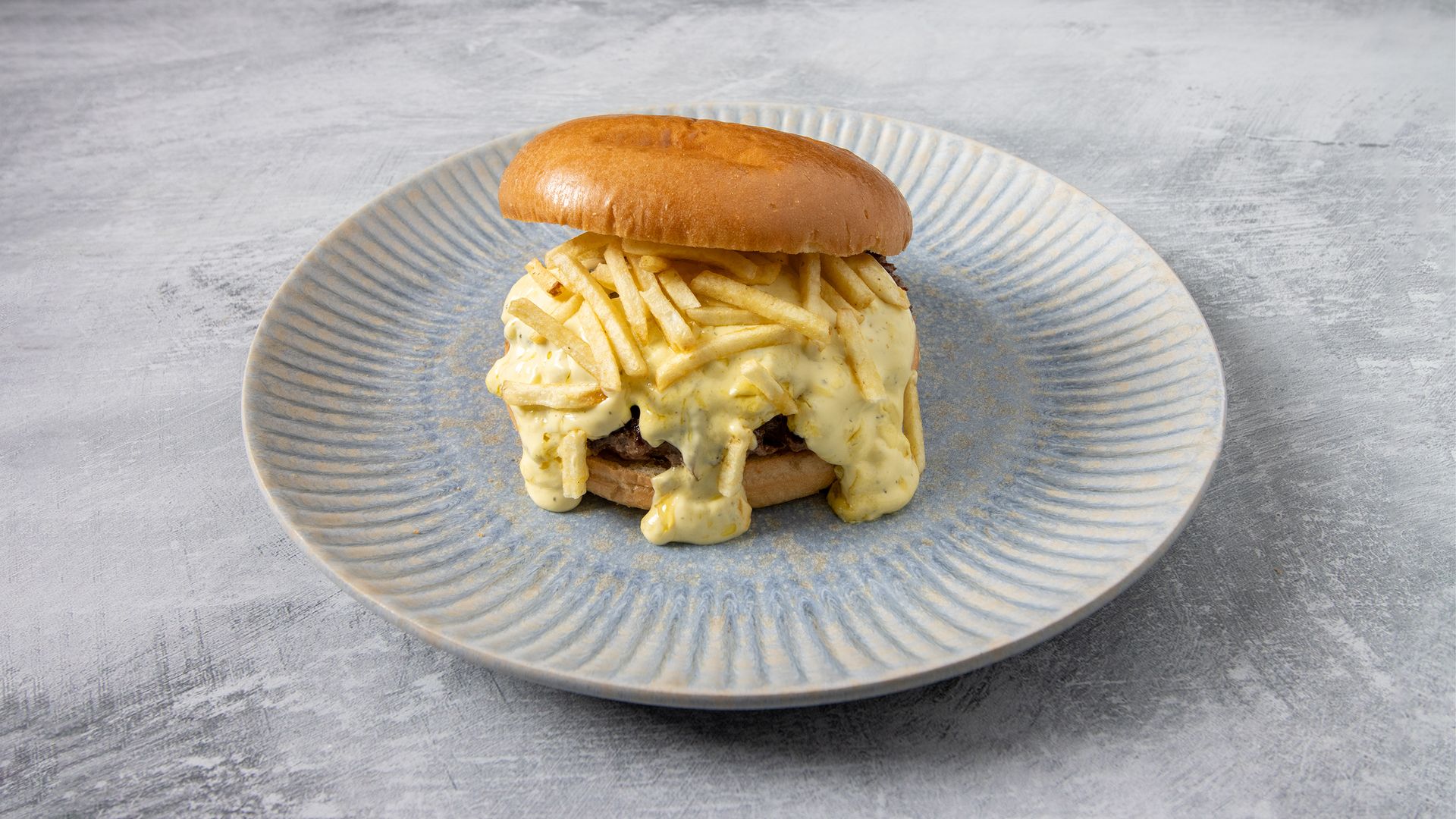 12.90€ Ranskanperunat, naudanpihvi 140g tai kanapihvi ,kevätsipulia, jalapeno, juustokastiketta ja secret majoneesi. -