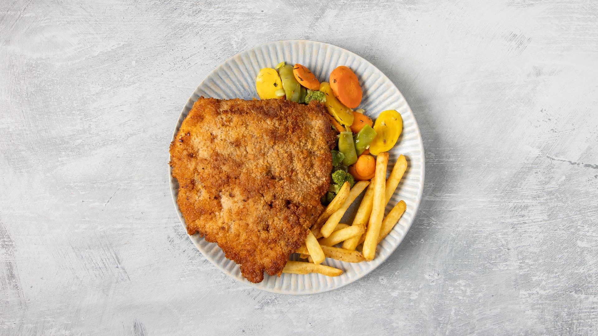 - Maalaisranskalaisia, paneroitu porsaanleike 160g, 100% kotimaista lihaa, lämmin kasvikset ja valitsemasi kastikkeen s